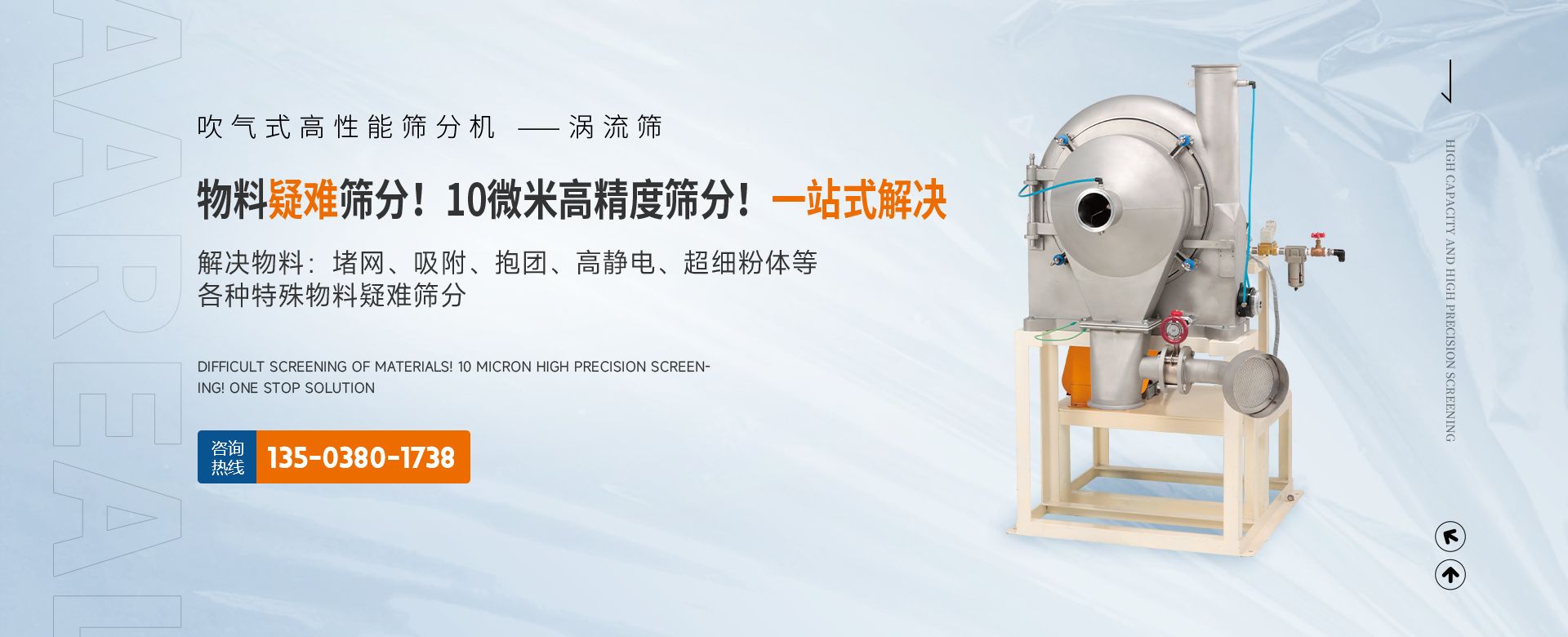 阿 瑞 爾(AAREAL)? 是從事篩分·過濾設備設計和制造的高新技術企業(yè),擁有先進的生產設備、粉體篩分分析實驗室,在中國廣州市設辦事處。祝賀:新鄉(xiāng)市超大產能精細篩分技術工程中心在阿瑞爾(AAREAL)成立?。?!在線大產能篩分和在線動態(tài)過濾是阿 瑞 爾(AAREAL)?的產品特點■ 在線大產能篩分,突破了傳統(tǒng)篩分觀念,工業(yè)化篩分,實現(xiàn)大產能、高能效篩分。以低故障率、低停機率、低使用成本、高產能、高精度、高能效為您帶來巨大意外收益?!?阿瑞爾(AAREAL)擁有的回轉篩分技術,擁有的近百種篩分解決方案及上千種物料的篩分經驗,會給您展現(xiàn)全新的篩分設備,幫您實現(xiàn)大產能篩分 高精度篩分 疑難篩分?!?阿瑞爾(AAREAL)的品質保證:阿 瑞 爾(AAREAL)? 是高品質篩分設備制造商高品質是阿 瑞 爾(AAREAL)? 質量準則。優(yōu)品設備 合理篩分是阿 瑞 爾(AAREAL)?回報客戶的驗收標準?!覀儾坏珦碛邢冗M的生產設備,而且對于每一道工序,每一個細節(jié),我們都要精工細作。對于客戶的每一個細微的問題,我們都要認真解決。——精心制作和用心服務是我們對客戶的責任。阿瑞爾(AAREAL)是您成功道路上值得信賴的、合作伙伴,以良好的質量、經驗和服務享譽多個國家,確保您安心地選擇每一件產品,阿瑞爾(AAREAL)竭誠與國內外商家雙贏合作,共同發(fā)展,共創(chuàng)輝煌!阿瑞爾(AAREAL)——您正確的選擇。
